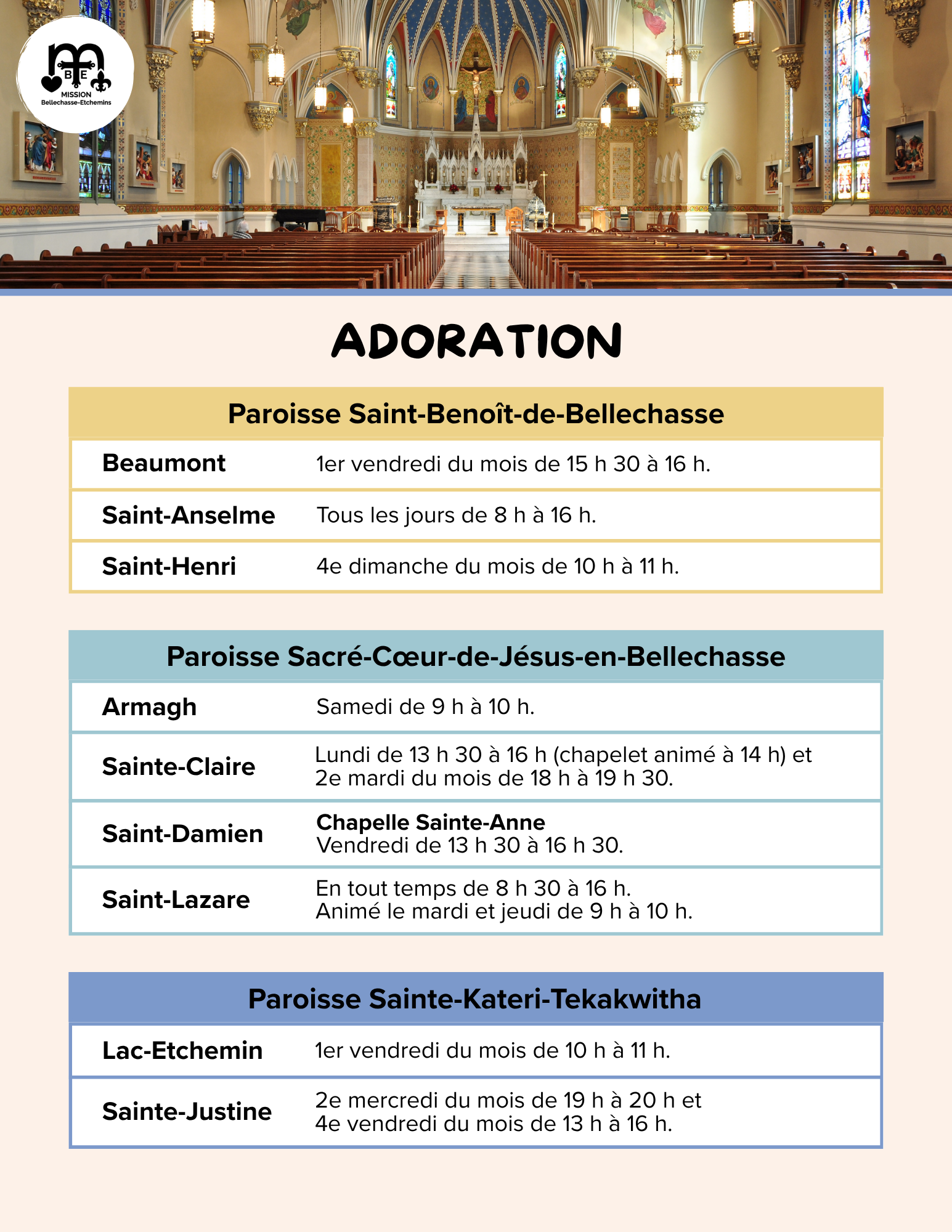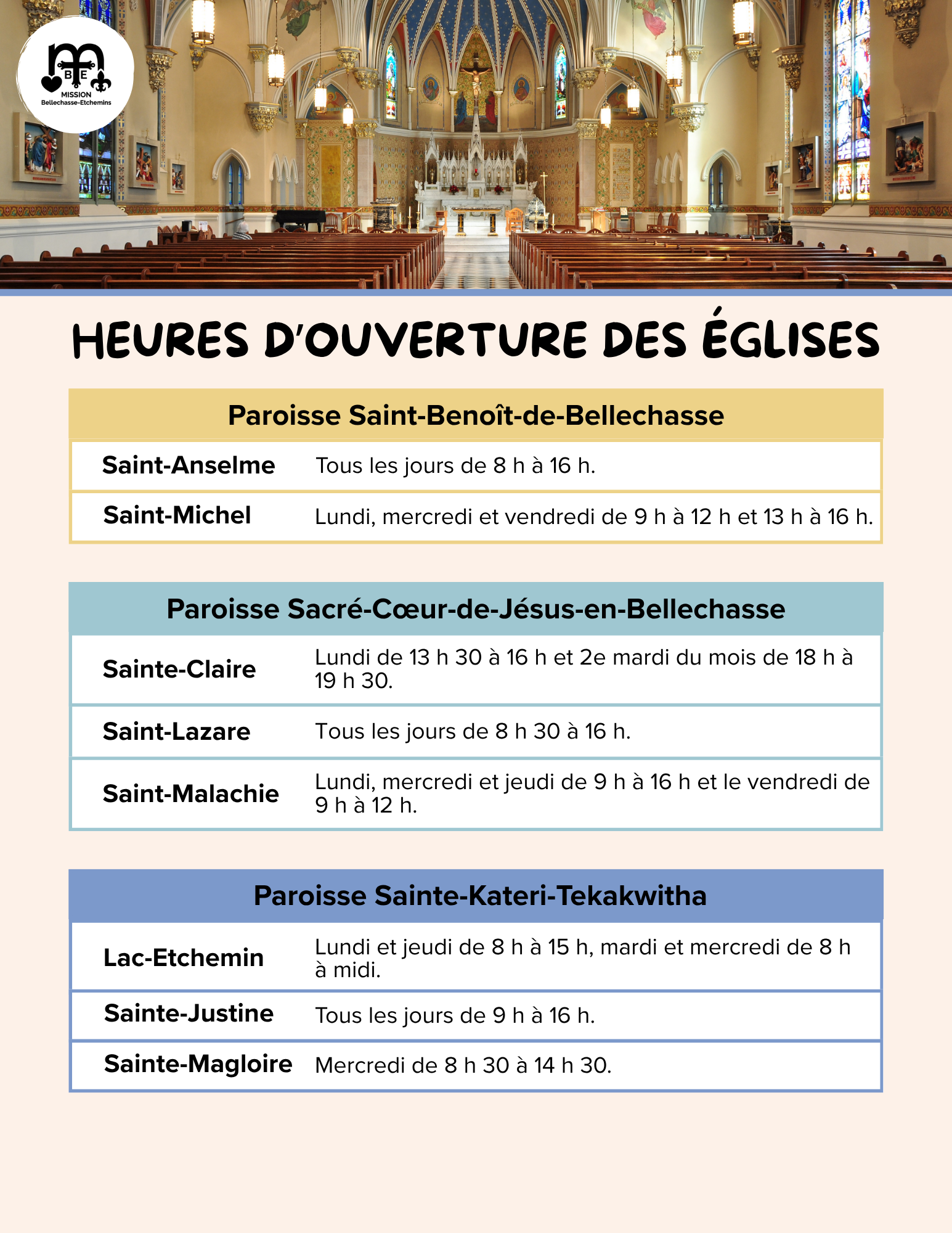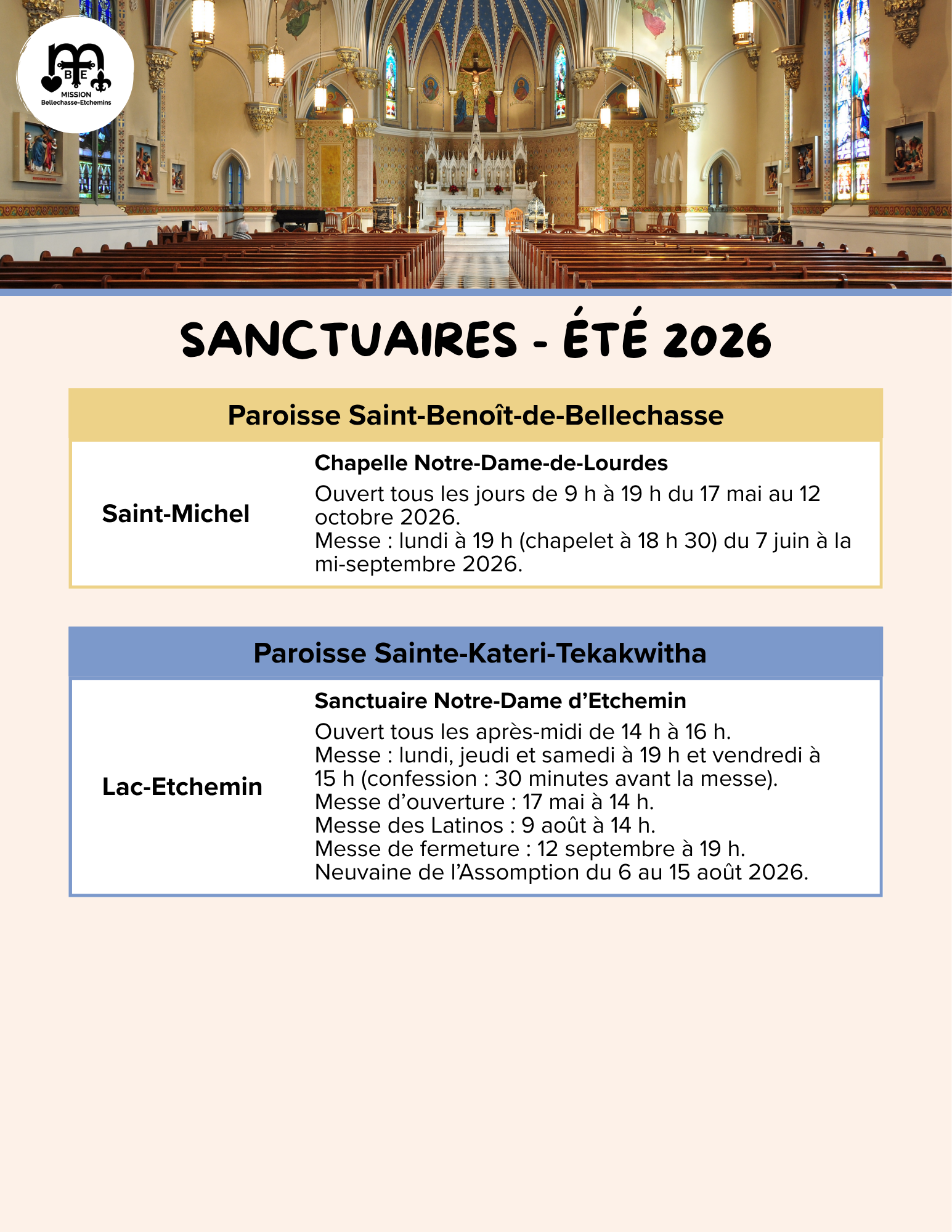 Horaires d’adoration, heures d’ouvertures des églises et des sanctuaires pour l’été 2026