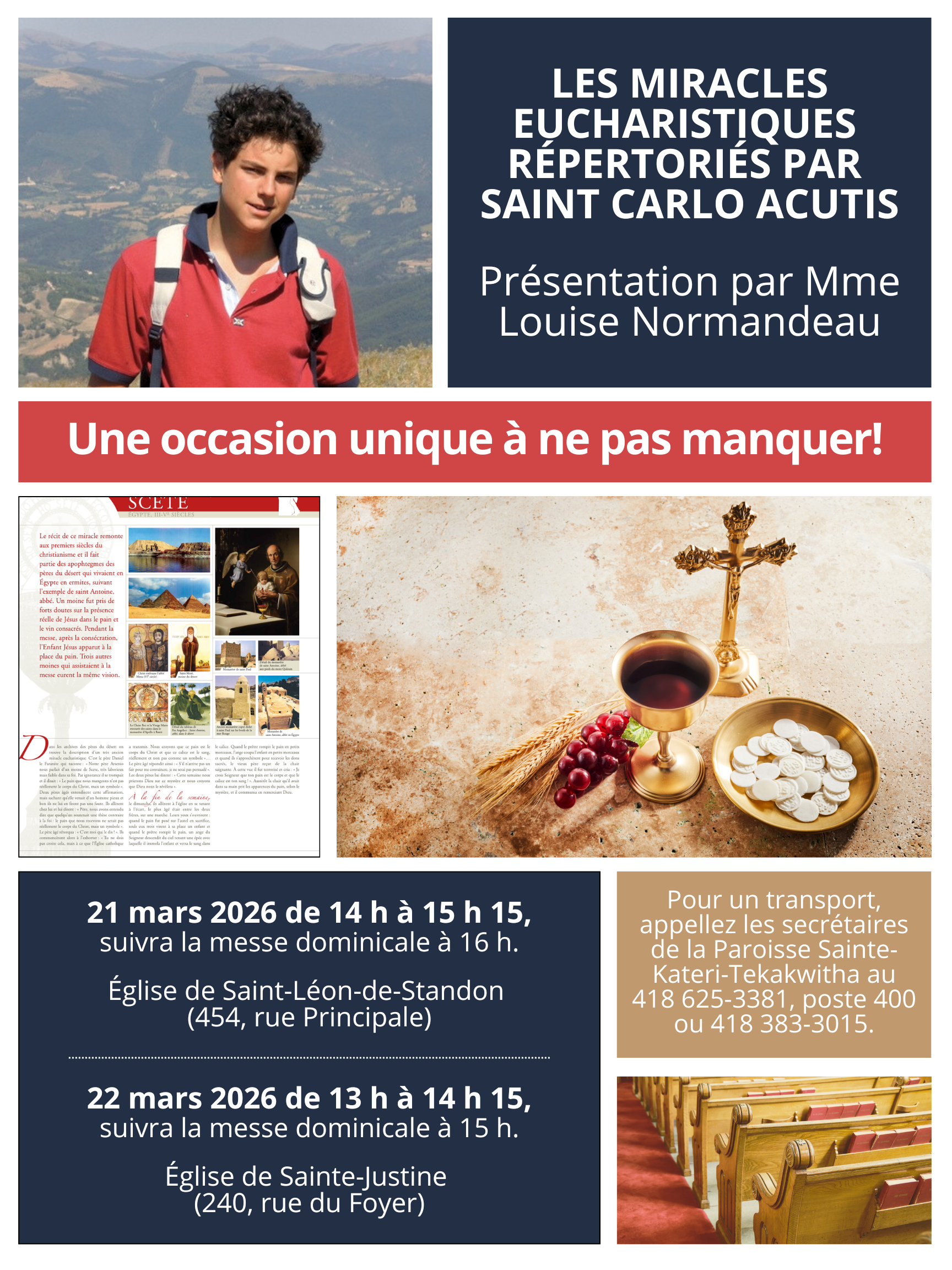 Les miracles eucharistiques répertoriés par saint Carlo Acutis – 21 mars 2026 à Saint-Léon-de-Standon et le 22 mars 2026 à Sainte-Justine